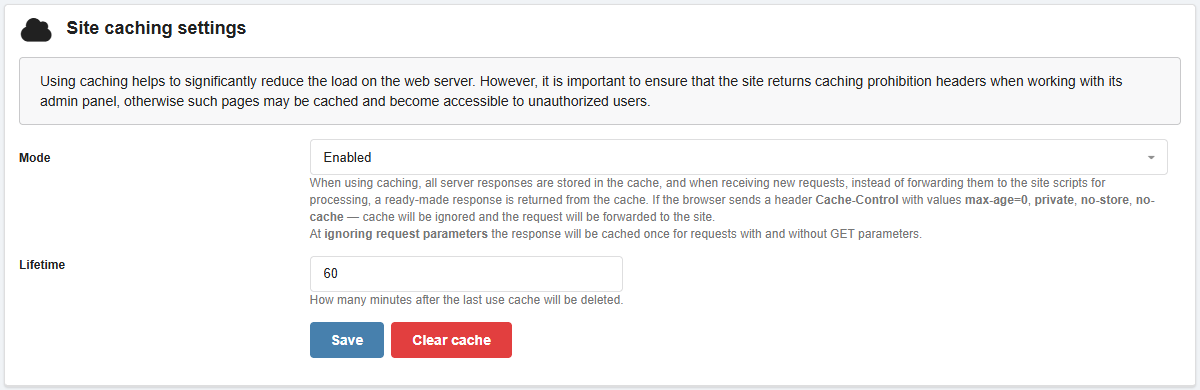 Caching is managed in the "Site settings" section on the new "Caching" tab. In the caching settings, you can select a caching mode with or without considering GET parameters and configure the cache lifetime.