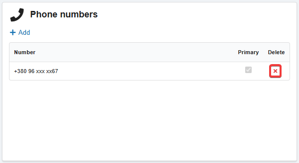 - On the "Basic info" tab, in the "Phone numbers" block, in the row with the number you want to delete, press ❌: