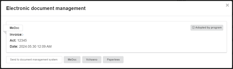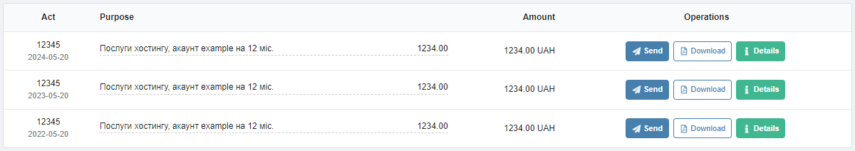 For Ukrainian legal entities is available the standalone "Acts" page, where you can view a list of all acts, send them to the electronic document management service, download and read the interpretation: