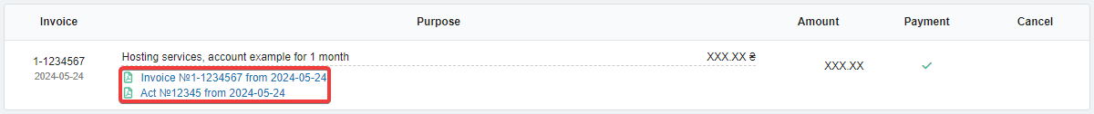 For payments made from the settlement account of FOP or legal entity, we provide invoices and acts of completed work. Once they are formed, they can be downloaded in the "Invoices" section: