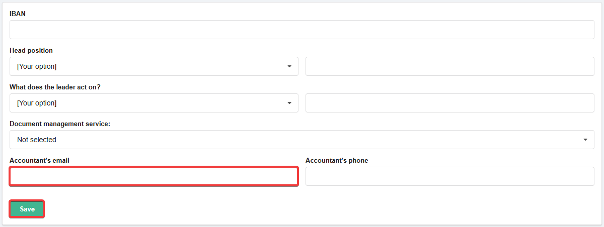 You can specify the accountant's email in the "Personal data" section on the "Personal info" tab in the "Accountant's email" field: