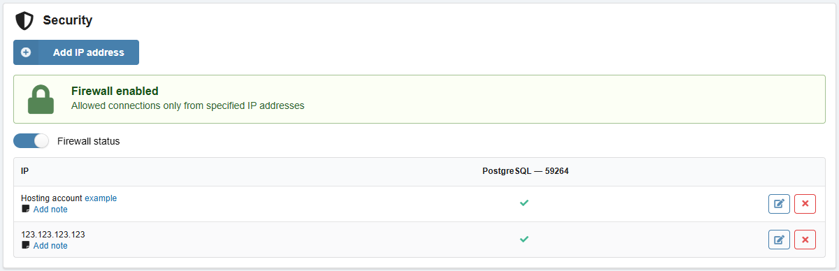- If there is one or more entries in the list and Firewall is enabled — the instance can only be connected to from these IP addresses / hosting accounts; access is denied to all others.