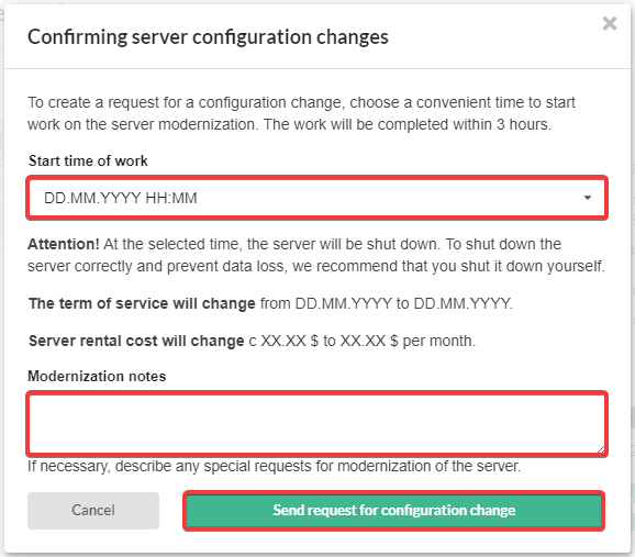 - Select the time to start work within the next 24 hours, add a note (if necessary), and click "Send request for configuration change":