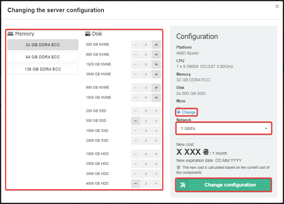 - Only RAM, disks, and extra services can be changed. The maximum amount of RAM, number of disks and their type, as well as the number of extra services depend on the platform and processor selected when ordering the server.