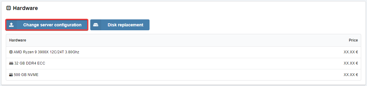 - In the "Dedicated" section on the "Hardware" tab, click "Change server configuration":