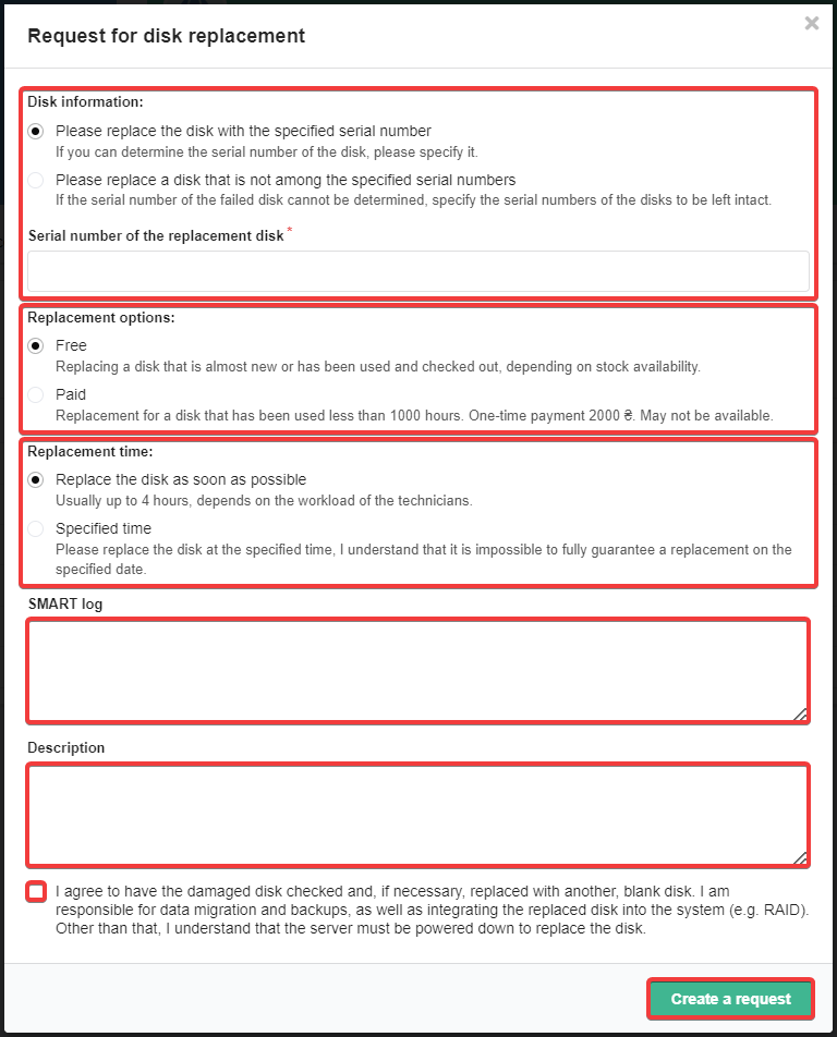 - "Disk information" — which disk needs to be replaced (serial number of the disk that needs to be replaced, or vice versa — a list of serial numbers of disks that do not need to be replaced).