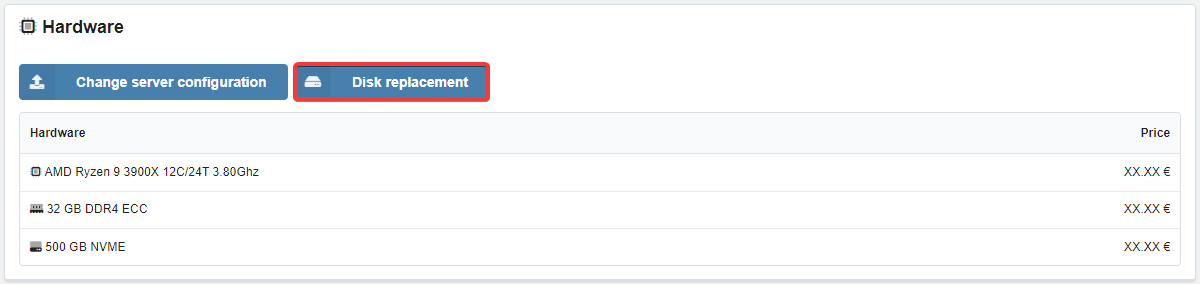 - In the "Dedicated" section on the "Hardware" tab, click "Disk replacement":