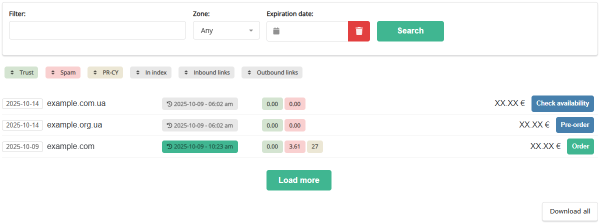"Download all" — downloads a list of released domains in TSV format according to the selected filters and sorting.