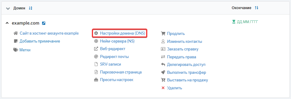 To configure a domain (add, edit, and delete its DNS records), open the "Domains" section and in the domain menu, click "Domain settings (DNS)":