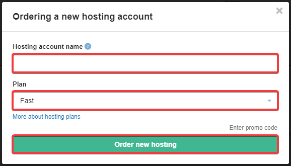 - Specify the desired name of hosting account (by default a name of letters and numbers is generated), select a plan and click "Order new hosting":