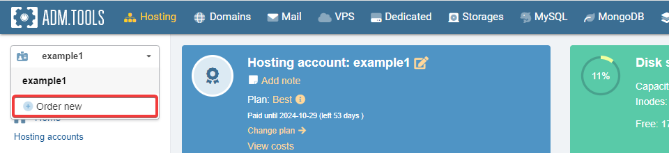 - In the "Hosting" section, expand the list of hosting accounts in the upper left corner and click "Order new":