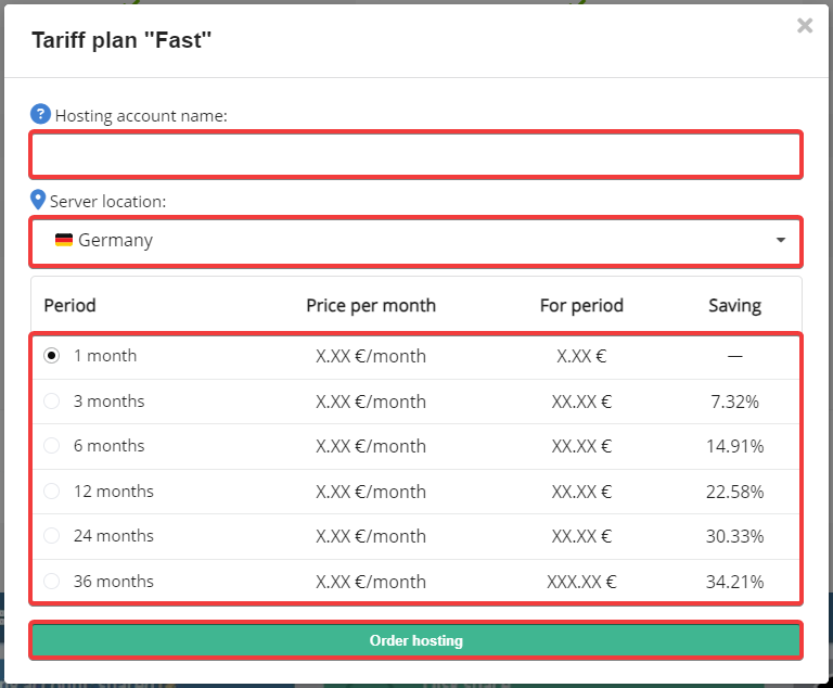 - Specify the desired name of hosting account (by default a random one of letters and numbers is generated), select the term of payment for the service (longer term — bigger discount) and click "Order hosting":