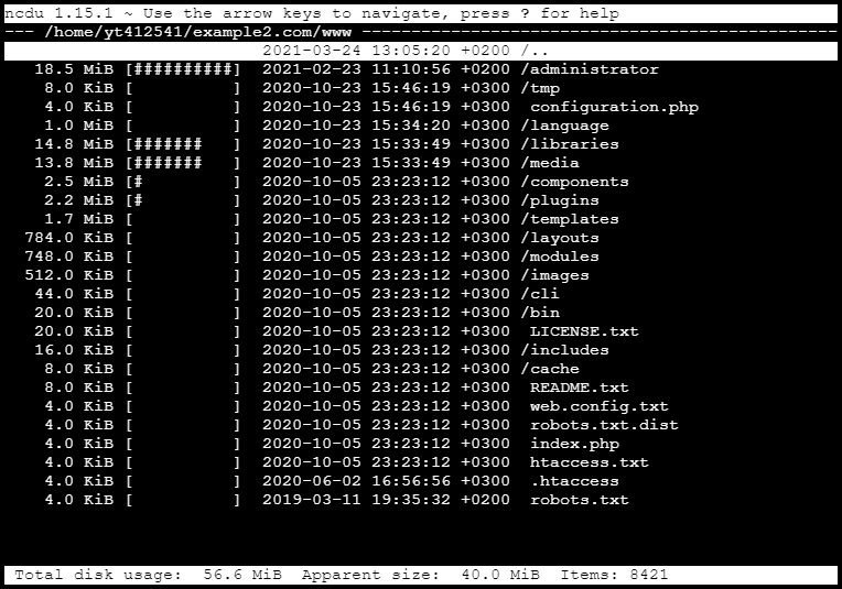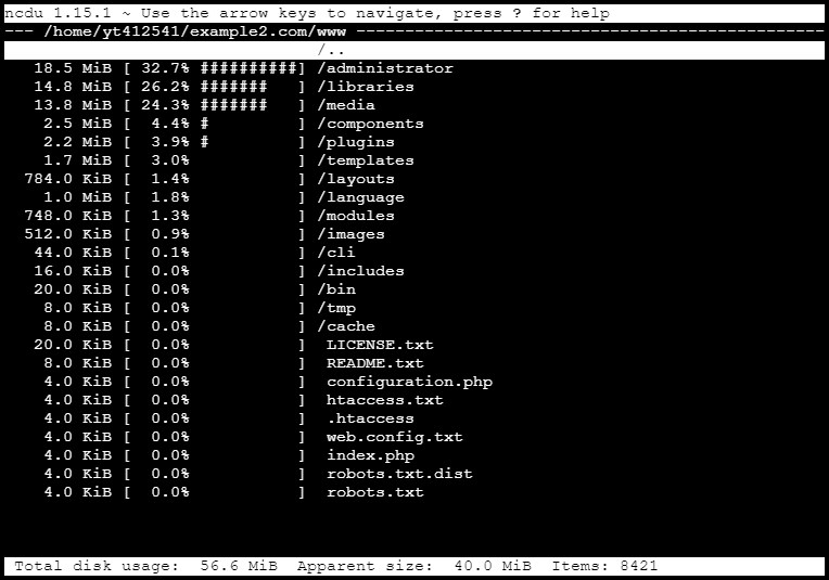 The utility ncdu (NCurses Disk Usage) allows for the analysis of disk space in an interactive mode. It displays data in a pseudo-graphical interface and enables quick navigation through the directory tree structure. It is available by default on all standard and business hosting servers.