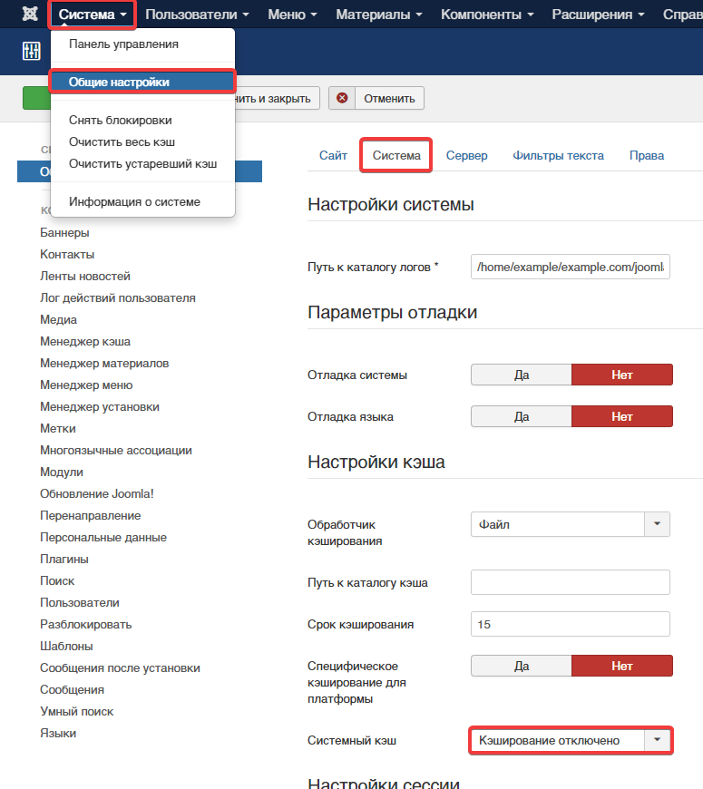To disable caching in Joomla!, in the site admin panel open the "System → Global configuration" section, switch to the "System" tab, and in the "Cache settings" block, select "Caching disabled" for "System cache":