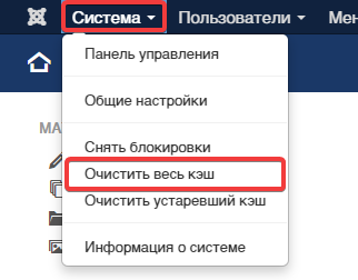 To clear the cache in Joomla! in the site admin panel, open the "System" menu and click "Clear all cache":