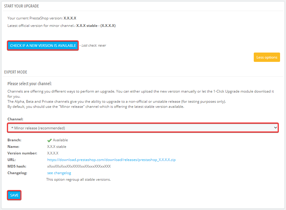 - In the "START YOUR UPGRADE" section, select the desired upgrade channel in the "Channel" field, save the changes, and click "CHECK IF A NEW VERSION IS AVAILABLE":