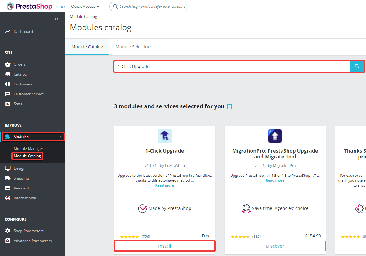 - In the side menu, in the "IMPROVE" section, go to "Modules → Module Catalog", enter