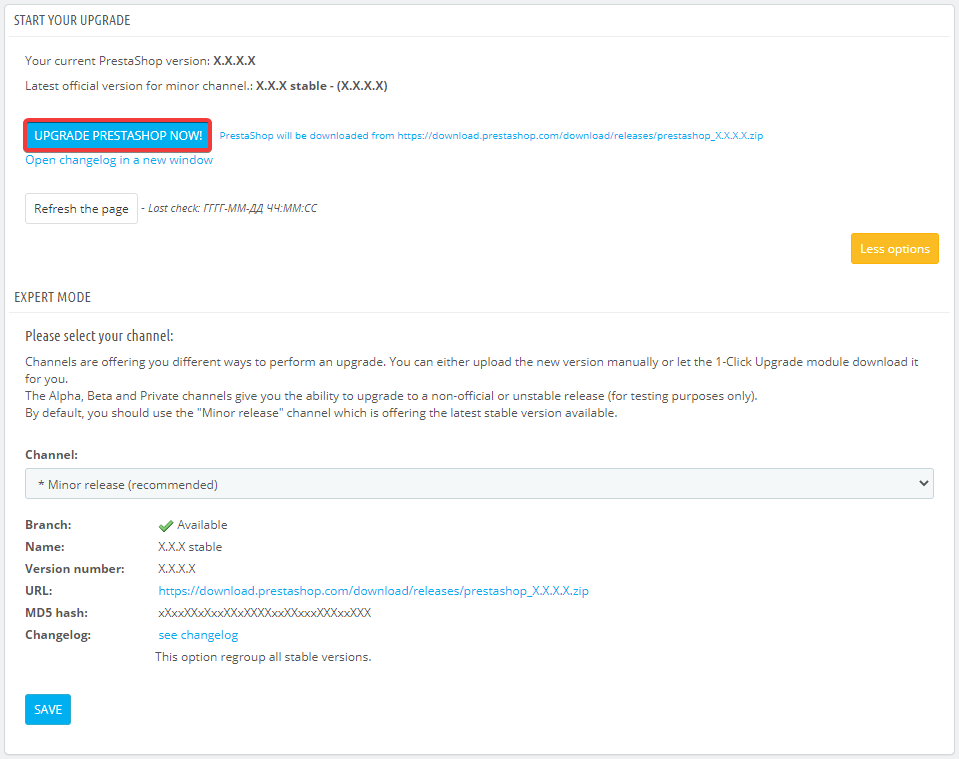 - In the "START YOUR UPGRADE" section, click "UPGRADE PRESTASHOP NOW!":