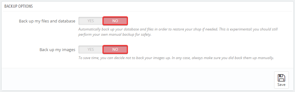 - In the "BACKUP OPTIONS" section, switch the "Back up my files and database" and "Back up my images" options to "NO":
