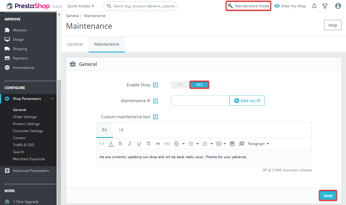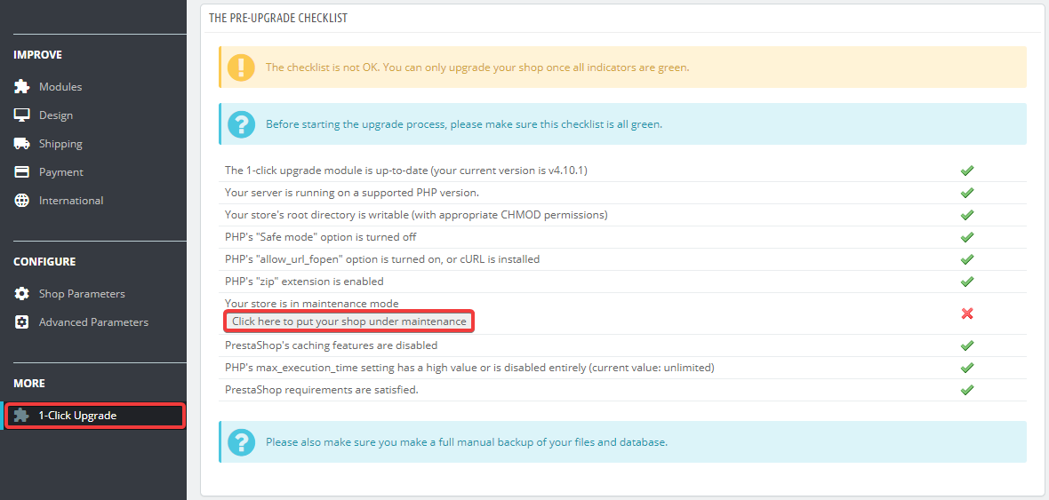- In the side menu, in the "MORE" section, go to "1-Click Upgrade" and in the "THE PRE-UPGRADE CHECKLIST" block, click "Click here to put your shop under maintenance":