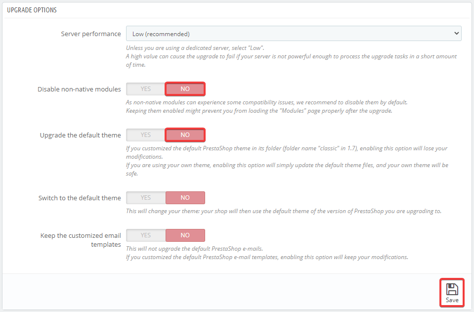 - In the "UPGRADE OPTIONS" section, switch the "Disable non-native modules" and "Upgrade the default theme" options to "NO" and save the changes: