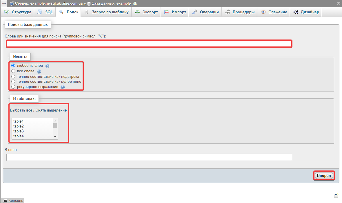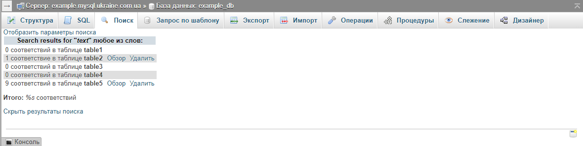2.6.1.2.1.9. Search database contents using phpMyAdmin