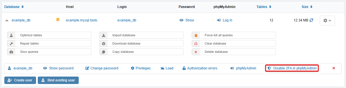 - In the list of database users, in the row with the user for whom two-step authentication was enabled, click "Disable 2FA in phpMyAdmin":