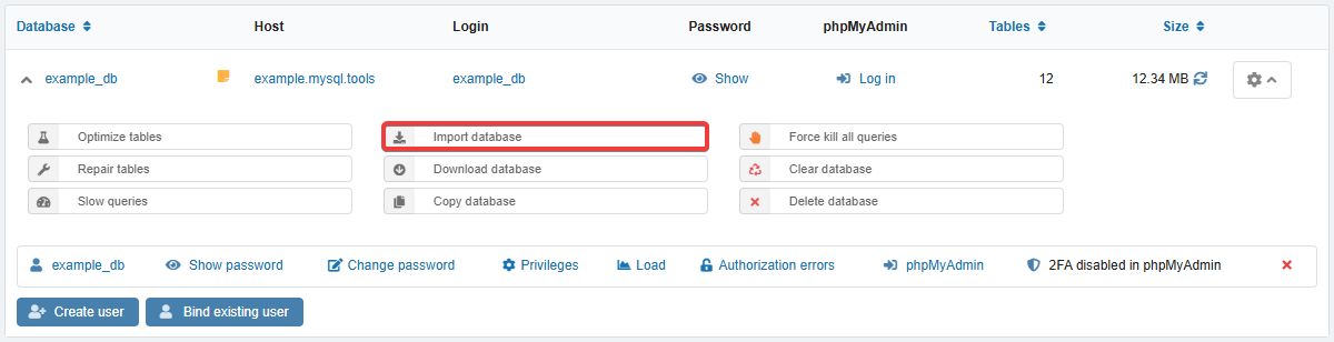 To import a database, you can use the file manager, console, phpMyAdmin (for SQL files up to 300 MB) or any MySQL client (e.g., HeidiSQL).