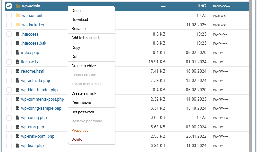 - "Open SSH" — opens WebSSH in a separate browser window. The working directory in the web client will be the current directory that was selected in the file manager.