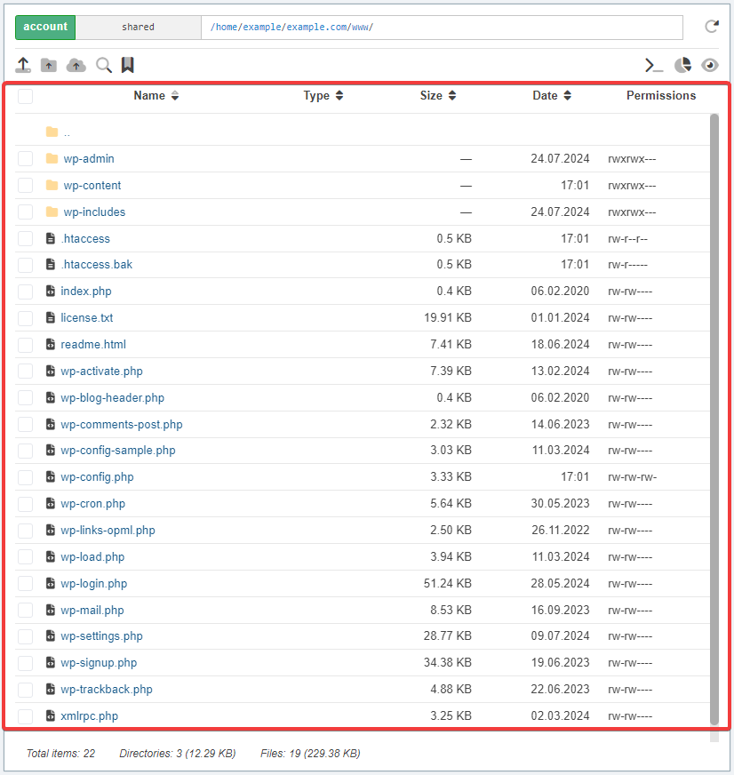 The file manager works correctly only with files and directories whose names are UTF-8 encoded. List items with names in unsupported encodings are displayed with an exclamation mark icon, grayed out and unclickable. Such situations can occur when UTF-8 was not enabled when uploading via FTP client. A possible solution is to re-upload the files by configuring UTF-8 in the FTP client (instructions: FileZilla, Total Commander, WinSCP).