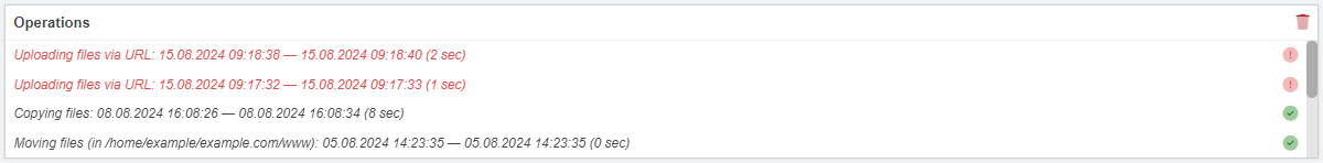 The start time, end time and execution time are displayed for each operation. Some operations can be interrupted using the gray cross button. Canceled or unsuccessful operations are displayed in red with an exclamation mark icon.