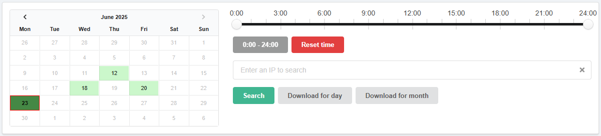 - "Download for month" — downloads the log for the month to which the selected day in the calendar belongs. ⚠️ The log for the current month includes all days from the beginning of the month, except the current one.