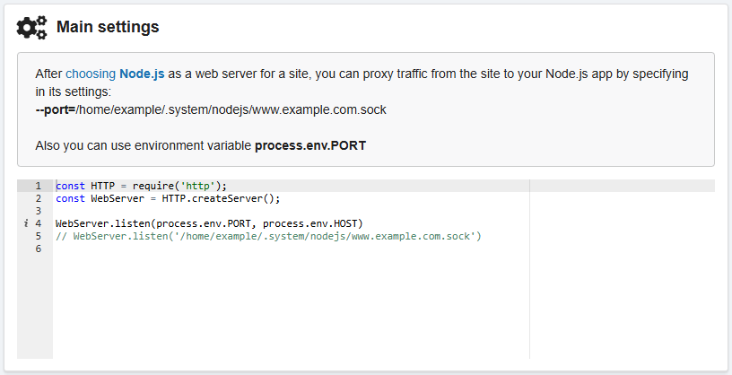 The proxying type is selected in the site settings when Node.js is enabled (see below). The data for using the selected type is displayed on the Node.js settings page. They are also contained in the environment variables process.env.PORT and process.env.HOST (respectively, the socket path and an empty value when proxying over a socket, or the port and IP address when proxying over an IP address).