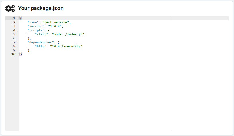 package.jsonfile and add the run command to it:"scripts": { "start": "node ./index.js" }Observe JSON syntax when adding the command!