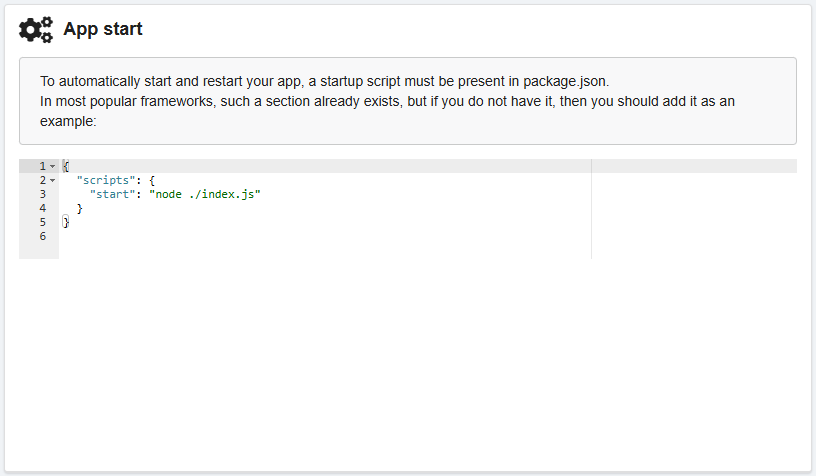 The "App start" block — contains the command to be added to package.json to start the app (/index.js in the command is the path to the main app file, the file name can be anything):