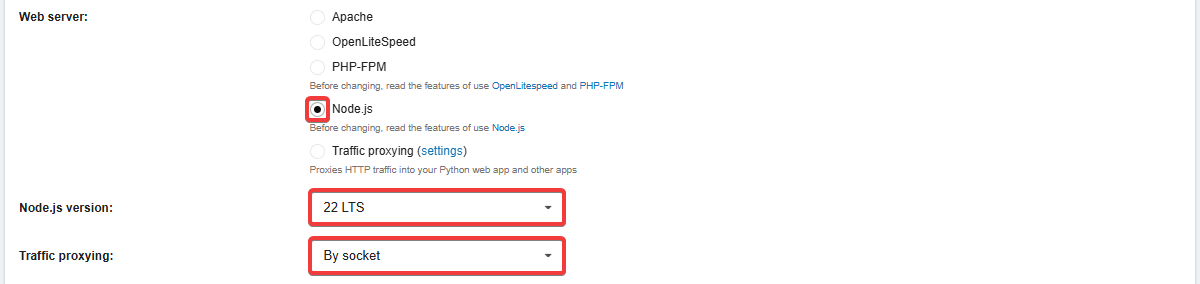 - Select the web server Node.js, the desired version, HTTP traffic proxying type and save the changes: