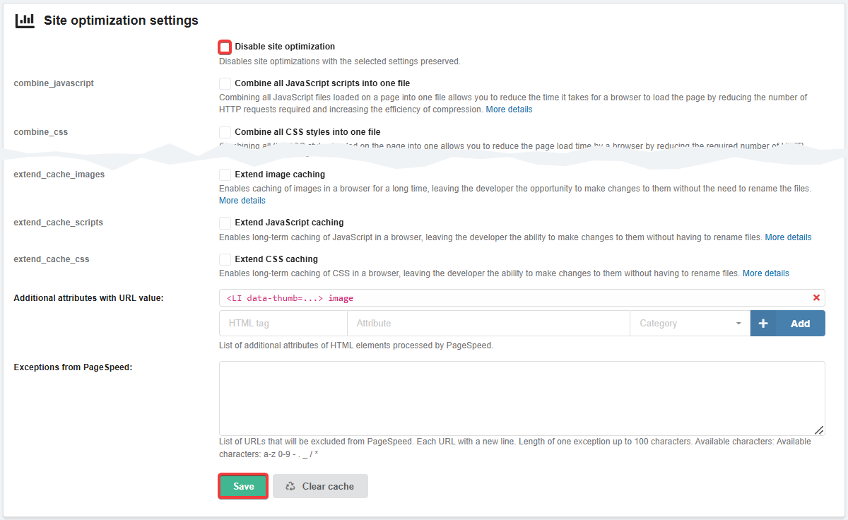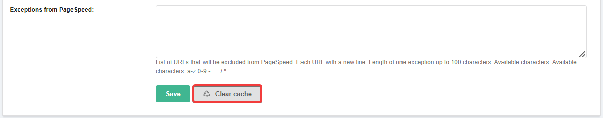 pagespeed cache cleaneruser agent. For example, redirect directives from the .htaccess file may interfere with such requests in some cases. In such a situation, the solution may be to temporarily rename this file while the cache is being cleared. - The cache clearing button is displayed only if optimization settings are enabled. If optimization or all its options are disabled, the button will not be displayed.