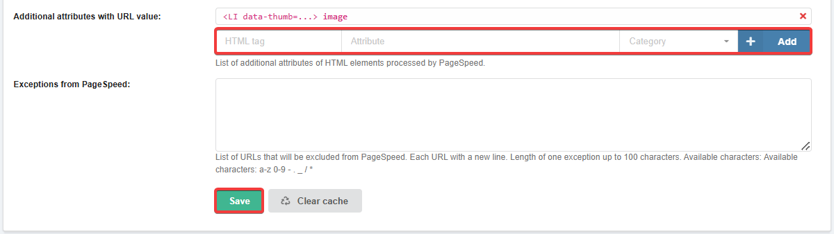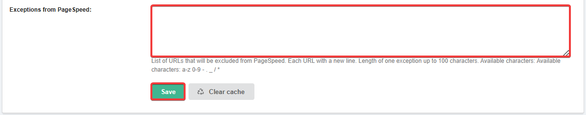 - On the "Site Optimization Settings" tab, in the "PageSpeed Exceptions" field, enter the URLs that need to be excluded and save the changes: