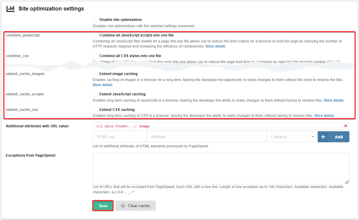2.17.2.1. Site optimization settings (PageSpeed)