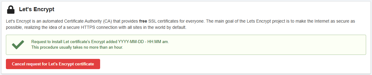- The certificate installation request is processed automatically, it usually takes no more than an hour.