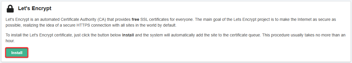 - Click the button to install the certificate:If the certificate is not yet installed, on the "Free certificate by Let's Encrypt" tab, click "Install":