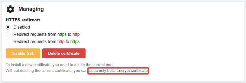 If there is an installed certificate but you need a new certificate from Let's Encrypt instead, click "issue only Let's Encrypt certificate":