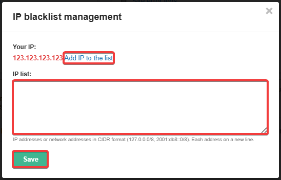 - Add IP to list — adds your current IP address to the list.