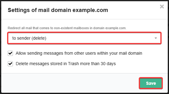 For messages that are sent to non-existent mailboxes in the mail domain, you can select the processing method.