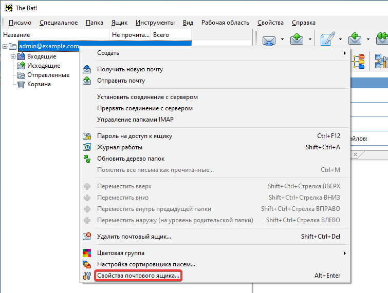 - Right-click on the added mailbox in the main window and select «Mailbox properties…»: