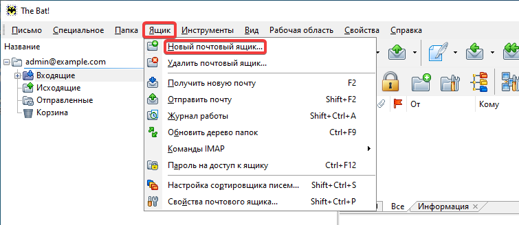 - In the top menu, click «Box → New mailbox…»: