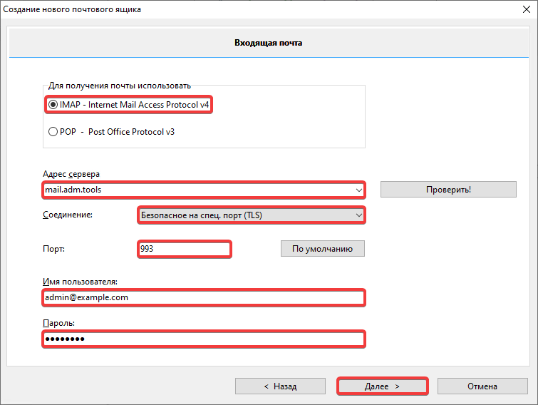 - «To receive mail use» — «IMAP - Internet Mail Access Protocol v4».