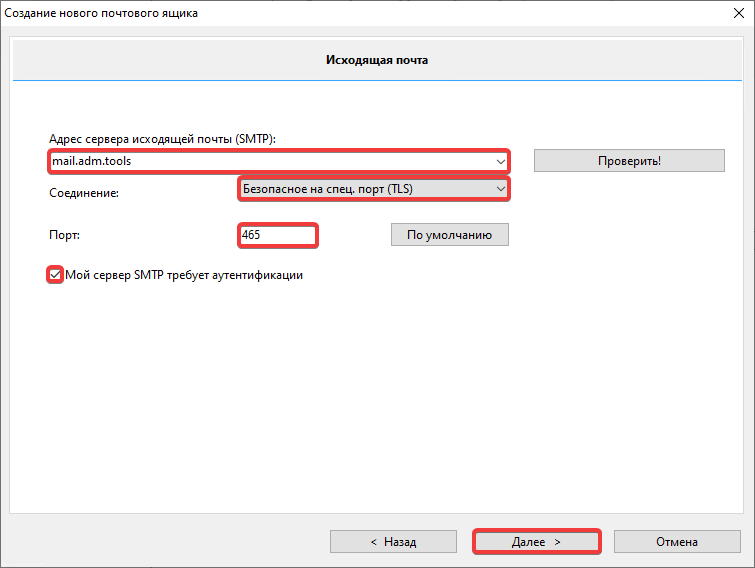 - Specify outgoing mail settings and click «Further»: