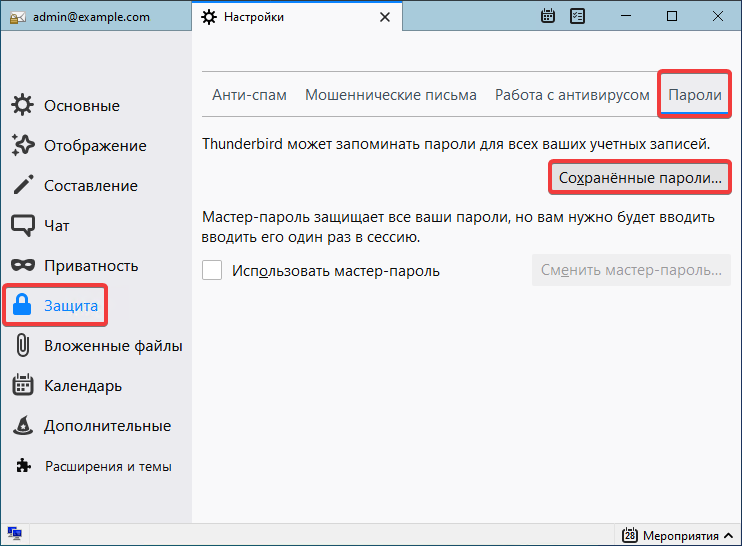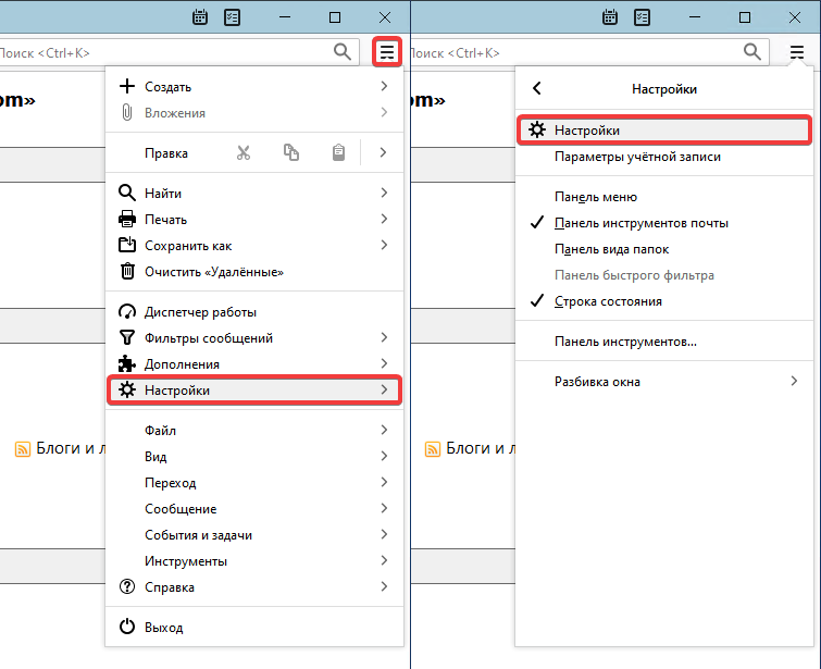 The article only describes how to change the password specified in the mail client. To change the password directly for the mailbox itself, use instruction.- Open the main Thunderbird menu and go to the section «Settings → Settings»: