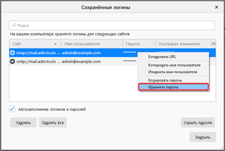 - Right-click on the line with the address of the desired mailbox, in the context menu select «Change password» and specify a new password (for each mailbox it must be specified in two lines — for IMAP or POP3 and for SMTP):